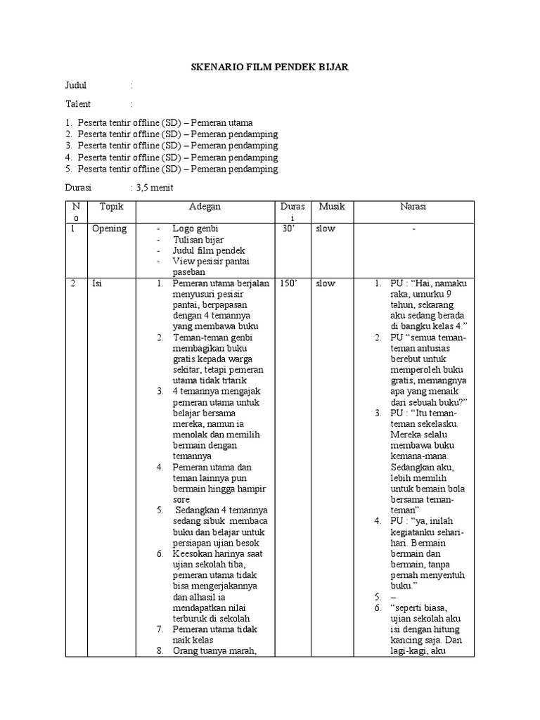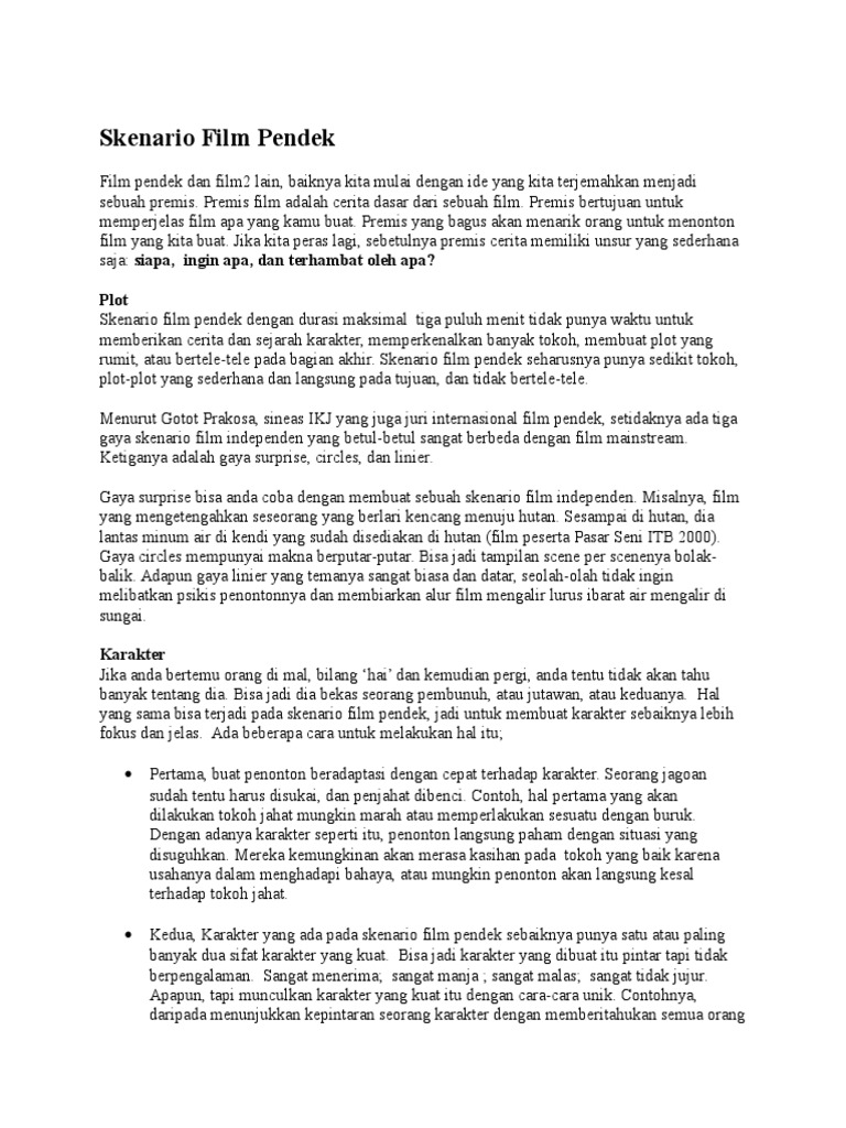 Saya akan menunjukkan skenario film pendek yang berjudul bolpoint. Dalam pembuatan sebuah film pastinya membutuhkan sebuah naskah untuk mencangkup semua isi dan latar cerita film tsb, untuk membuat contoh skenario film pada kesempatan kali ini admind akan berbagi pengetahuan. Biasanya, untuk skenario film durasi yang dibuat adalah 90 menit, dan cerita harus selesai. Film pendek ini akan diproduksi secara indie oleh simponi & filmmaker indie. Setiap ide yang terlontar umumnya masih sangat dini, mentah dan masih jauh dari kenyataan. Riuh tawa sang anak membuat suasana rumah kala itu terlihat untuk selanjutnya akan disajikan : Contoh membuat skenario film pendek yang benar dan lengkap. Berikut adalah skenario film pendek durasi 10 menit. Contoh skenario film pendek 6ngeg35xvklv. Candy memories durasi 30 menit ide permen bulat yang mempertemukan antonio dan nina sebagai sebuah symbol cerita masa lalu dan masa depan. Lalu, bagaimana sih caranya menulis skenario yang baik? Walaupun hanya berdurasi 5 menit, 10 menit, sampai maksimal 30 menit. Inilah 6 cara membuat script film pendek yang perlu di.